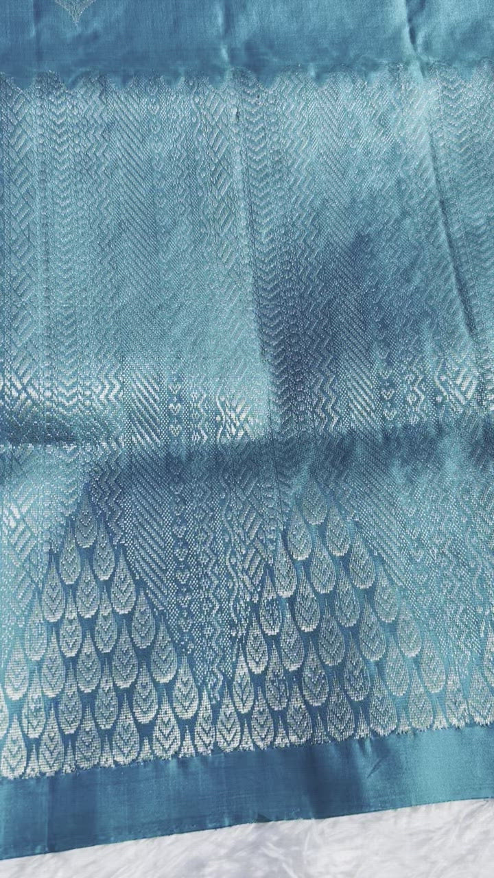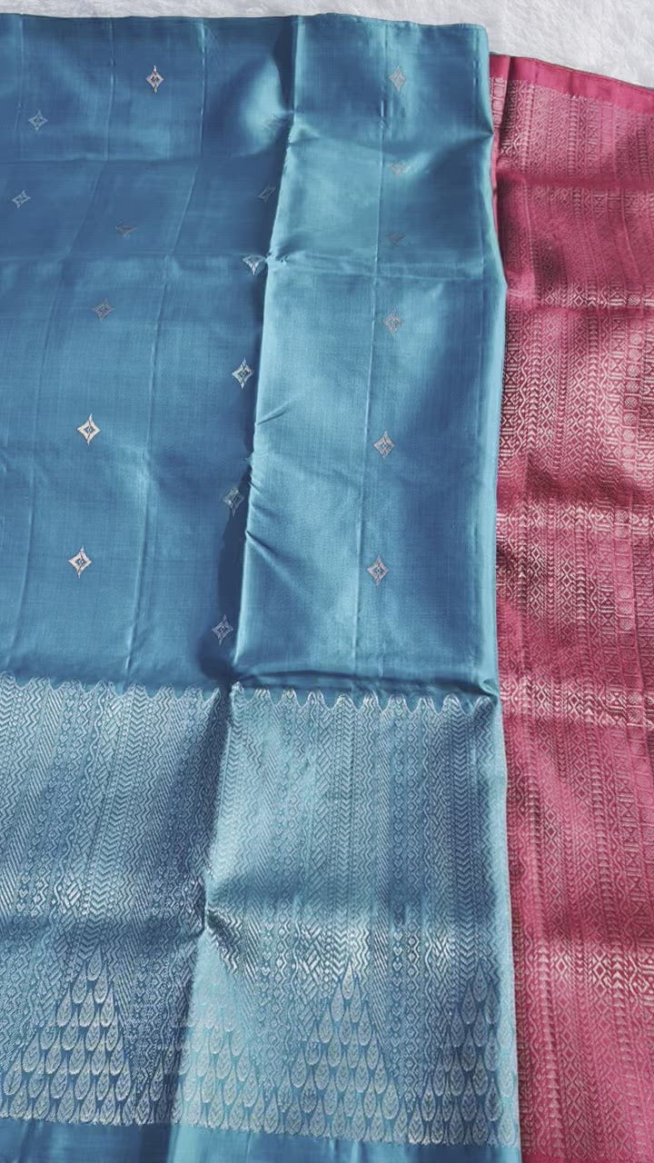 Rich and elegant blue saree with deep pink pallu and silver zari