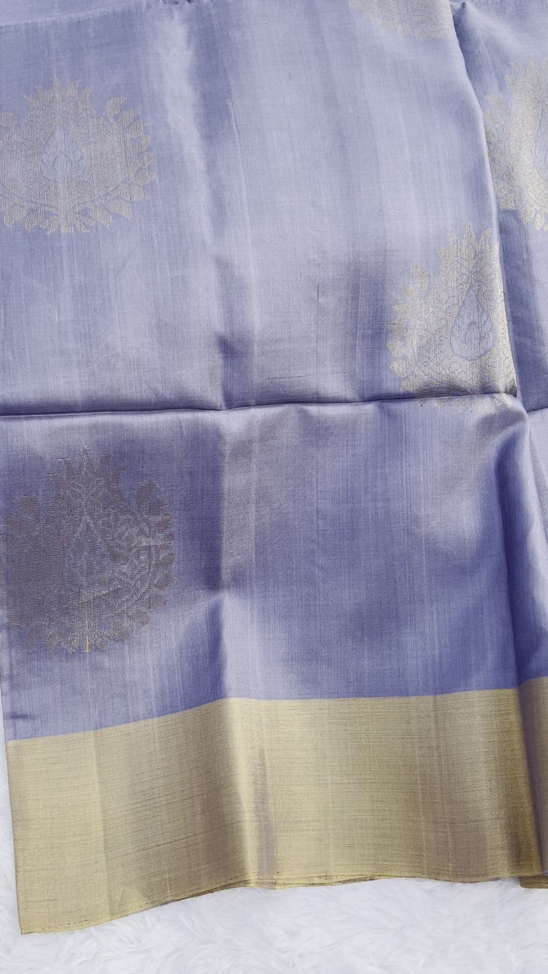 Elegant and rich blue-gray saree with dark green pallu and golden zari borders..