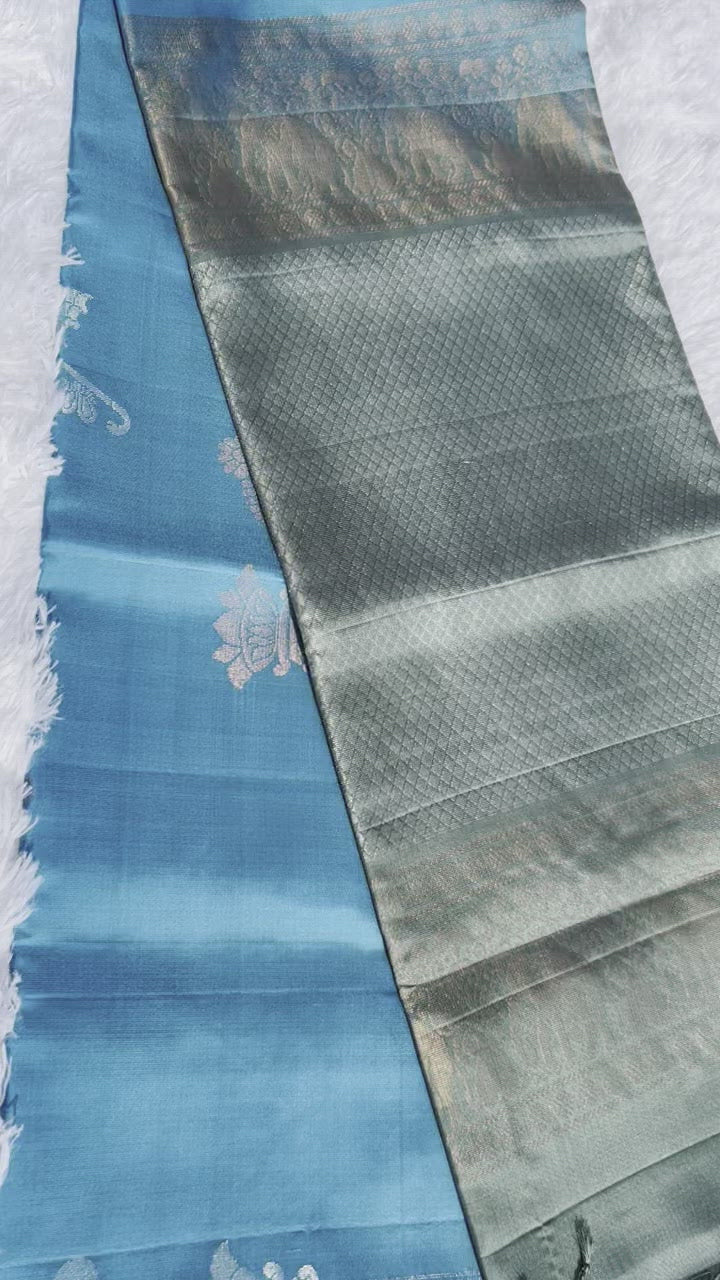 Sky Blue Saree with olive green pallu and silver zari. Saree has unique designs all over the saree in silver zari.