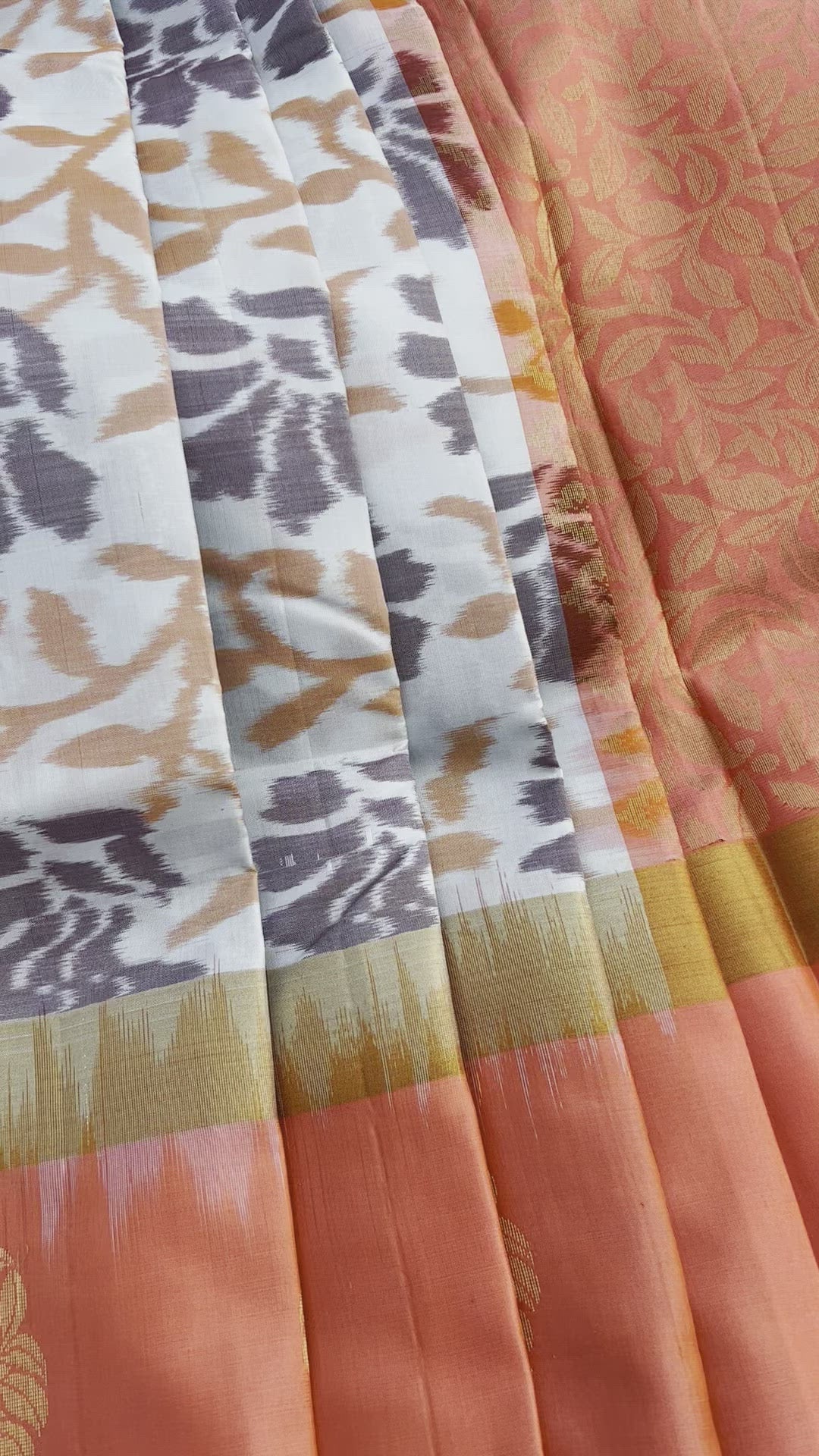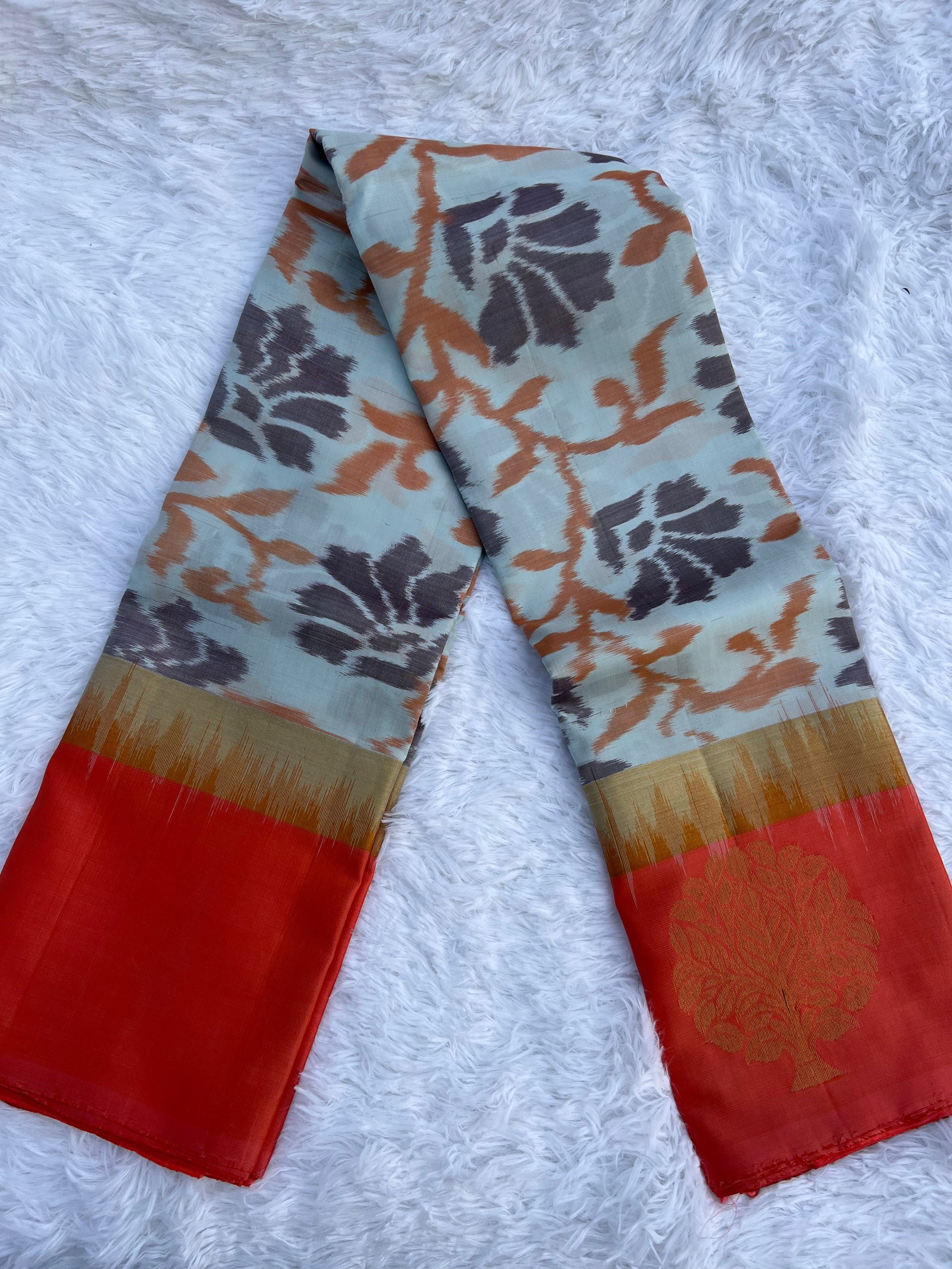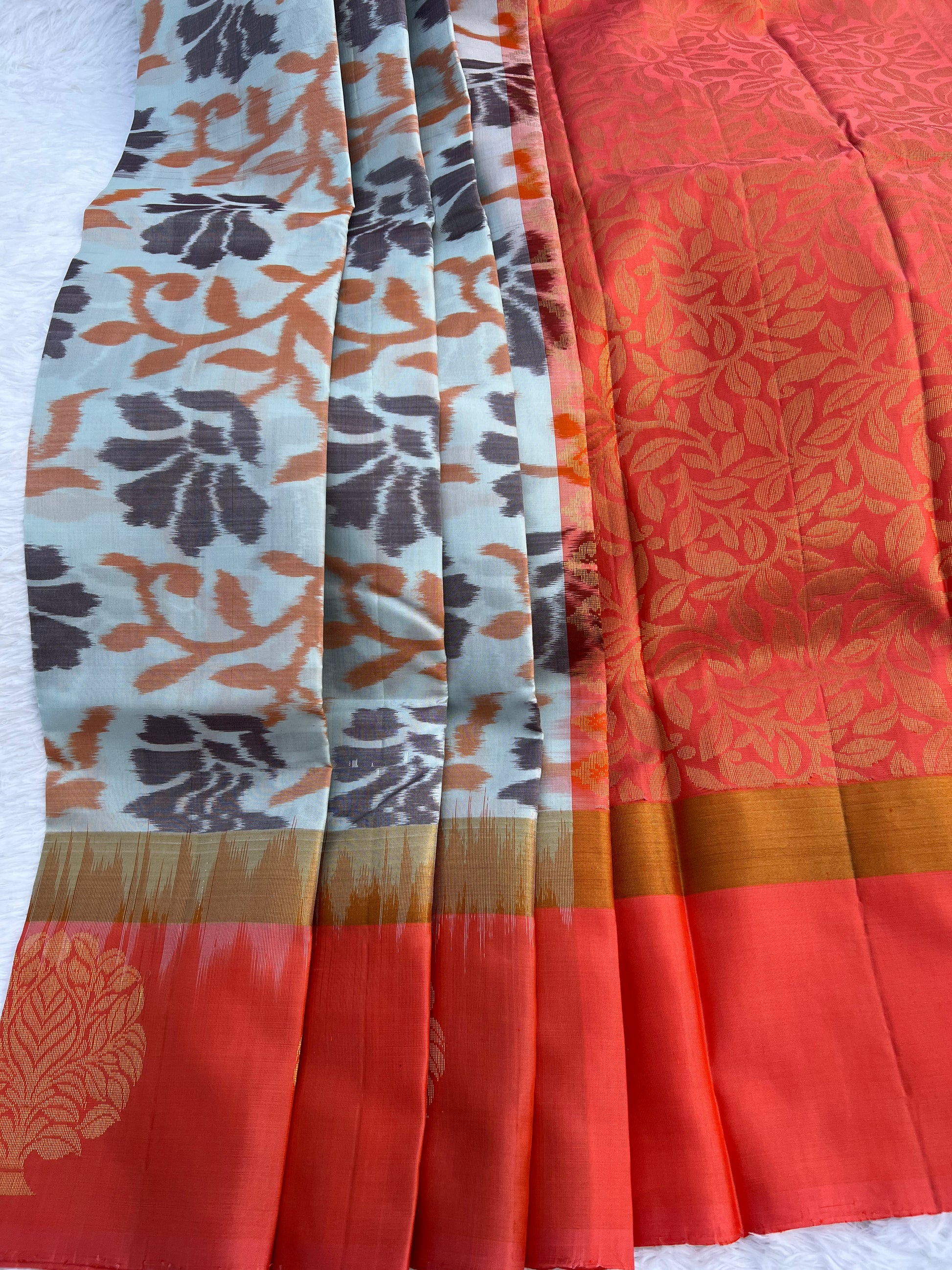This is a unique saree with an allover weave and contrast orange border and pallu