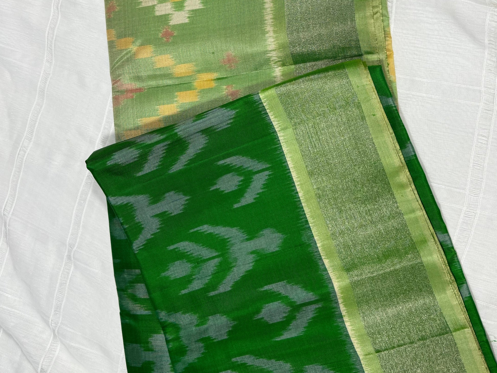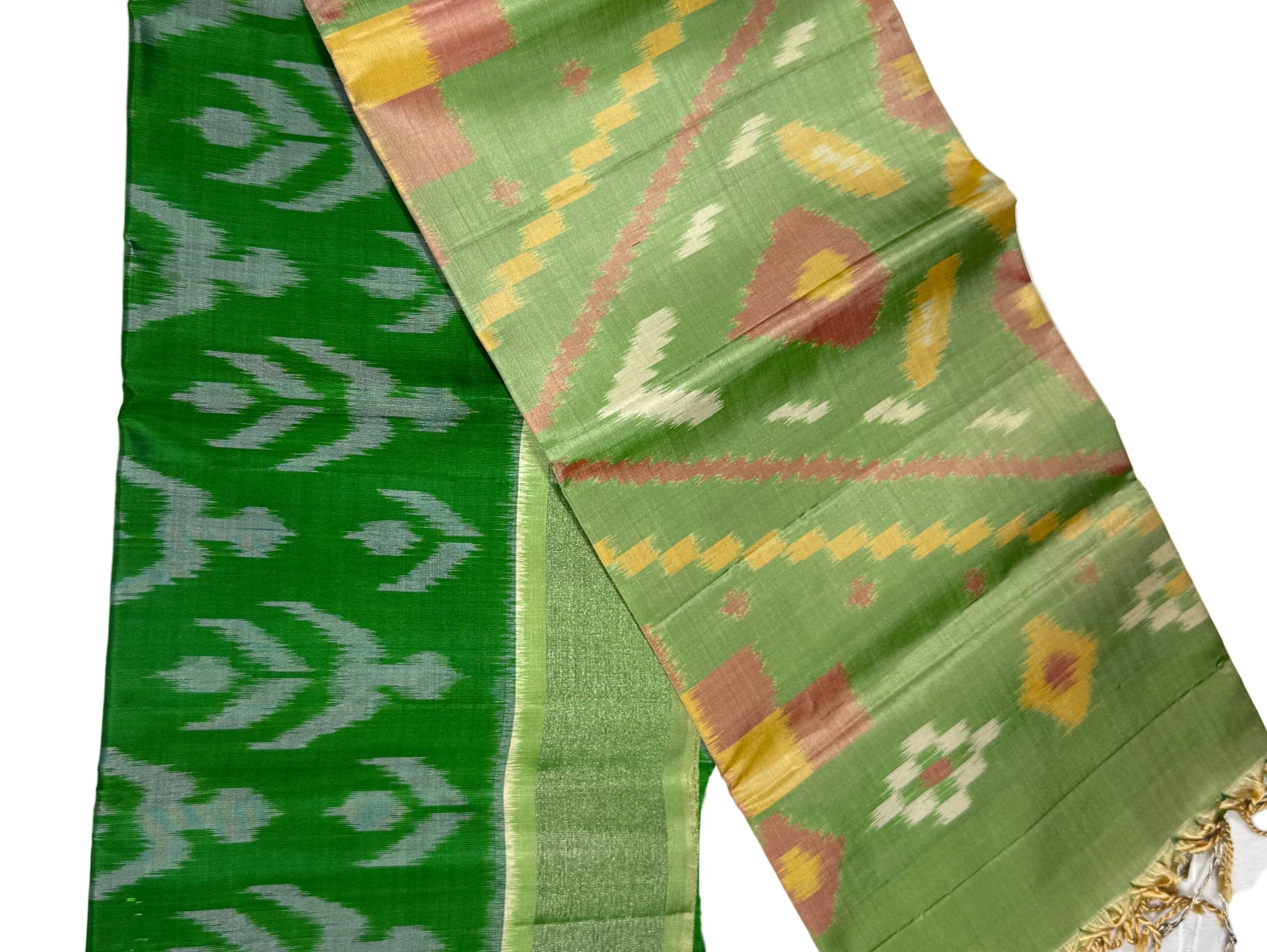A vibrant green Ikat silk saree featuring soft silver woven motifs across the body. The light green pallu with traditional Ikat patterns and a subtle zari border adds a fresh, elegant contrast.