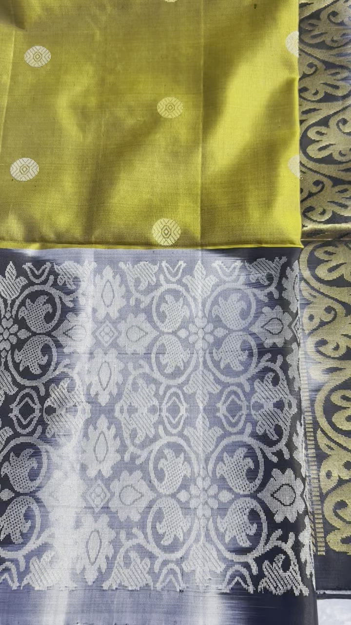 Bright olive green saree with gray- black tie-dye pallu and border.
