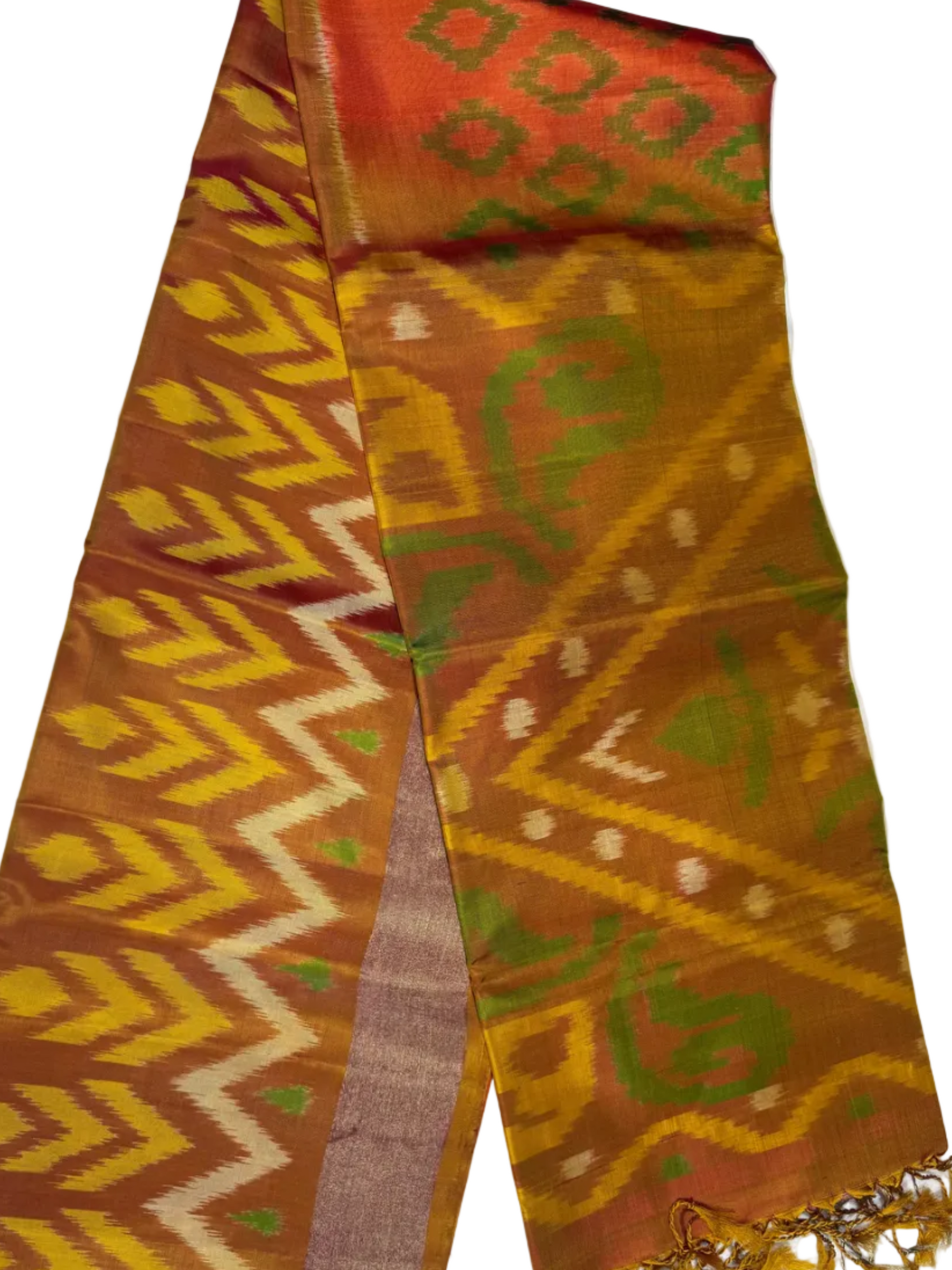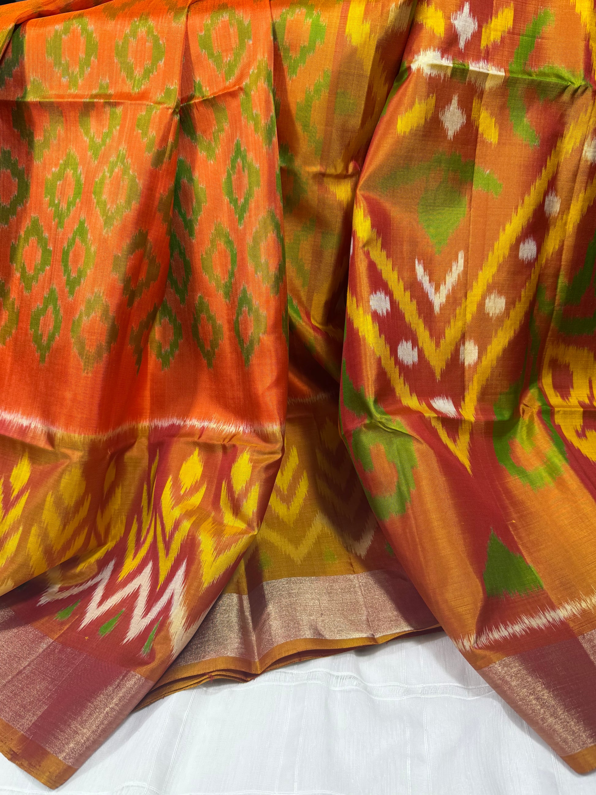 A vibrant orange Ikat silk saree featuring classic green woven motifs across the body. The rich mustard pallu with traditional patterns and soft zari border adds warmth and festive elegance, finished with delicate tassels for a graceful touch.