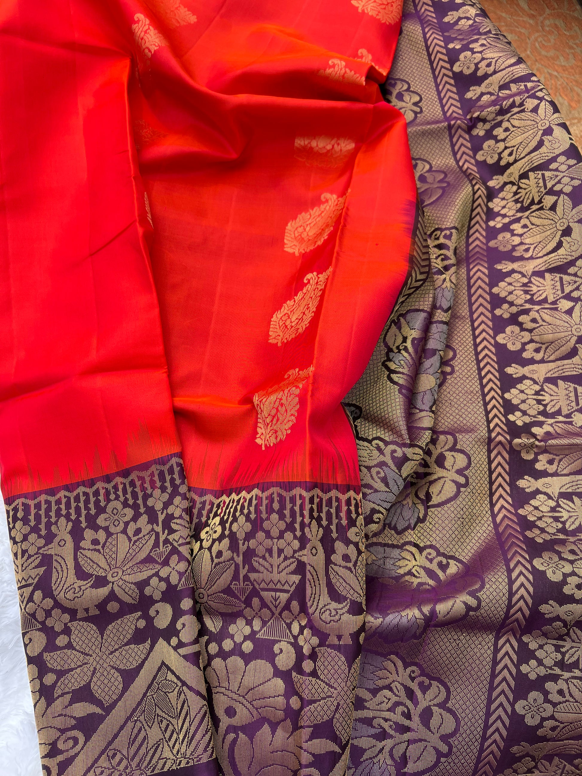 An orange-red saree with a purple border and pallu will make you look stunning and stand out from the crowd
