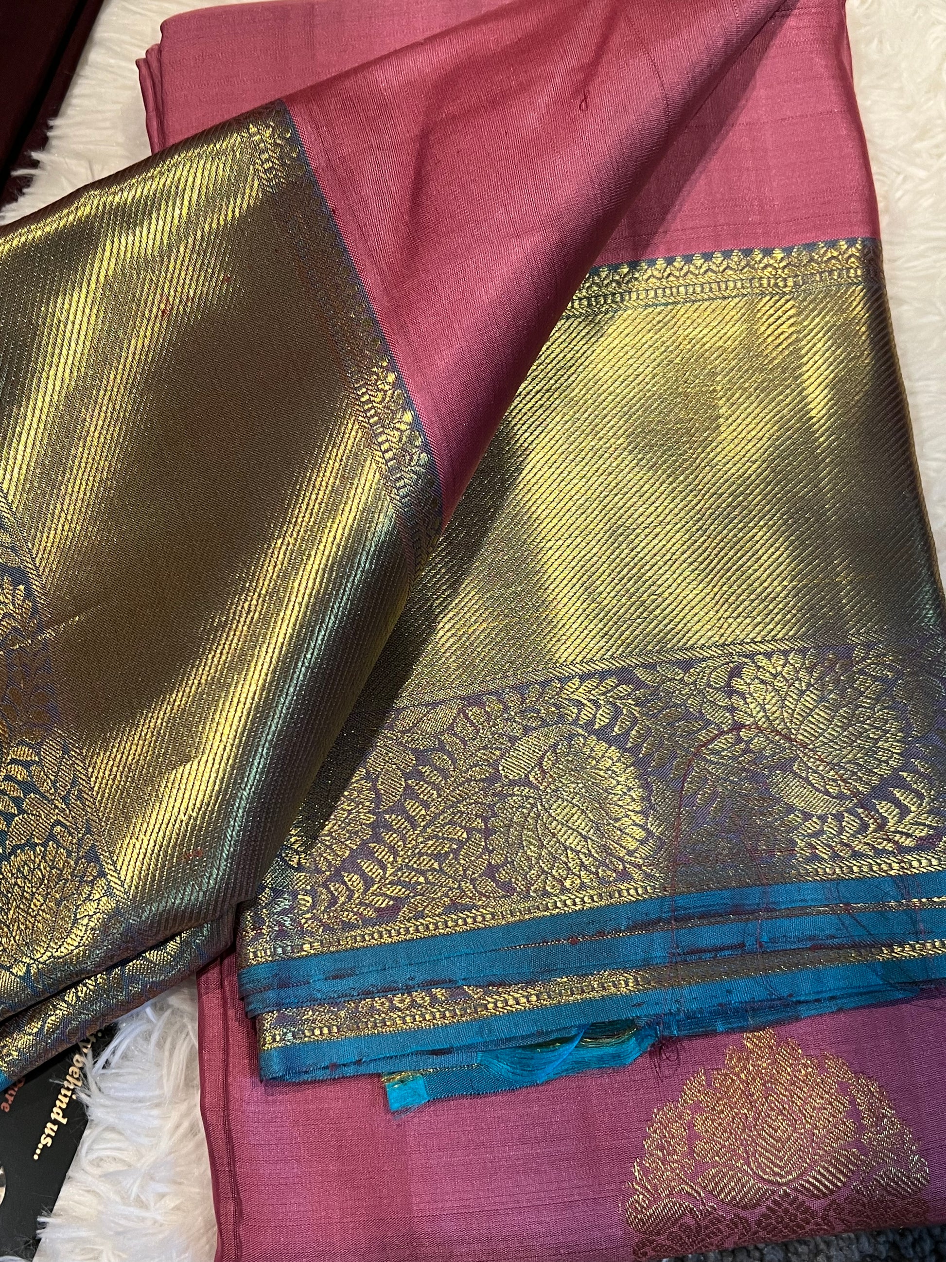 Pink 2G zari Bridal Kanchi Saree with blue pallu and blouse