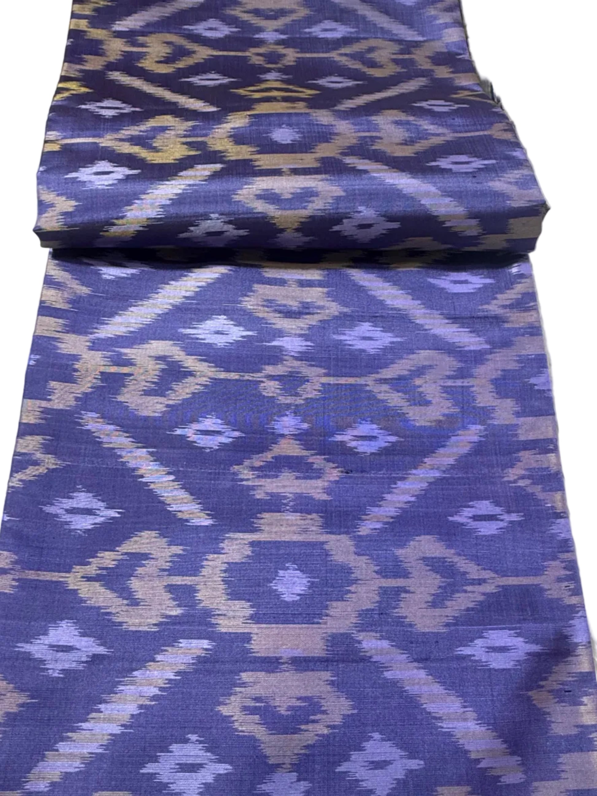 A graceful lavender Ikat silk saree featuring artistic woven patterns, beautifully complemented by a rich gray and gold Kanchi border. The intricate zari detailing adds classic temple-inspired elegance, creating a perfect blend of tradition and sophistication.