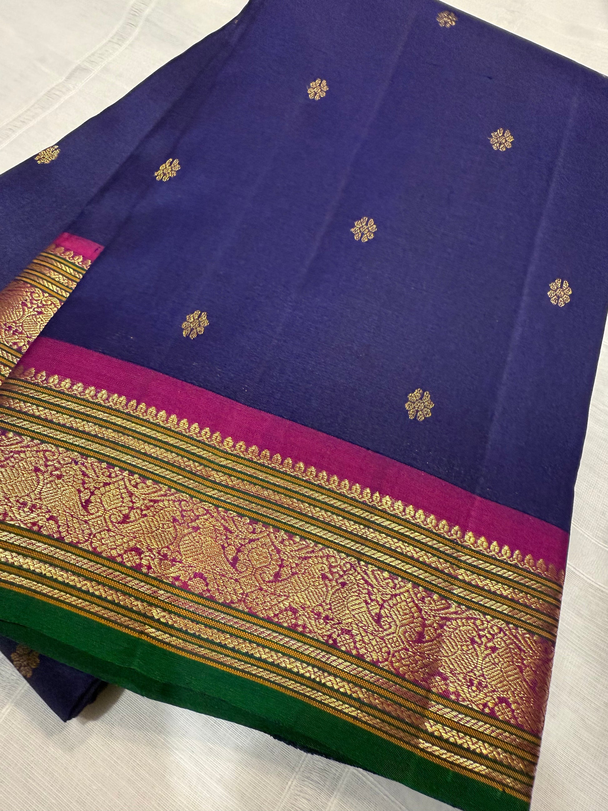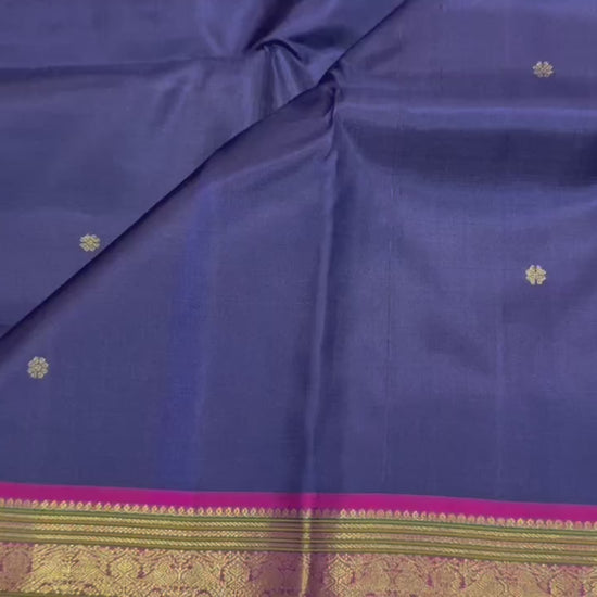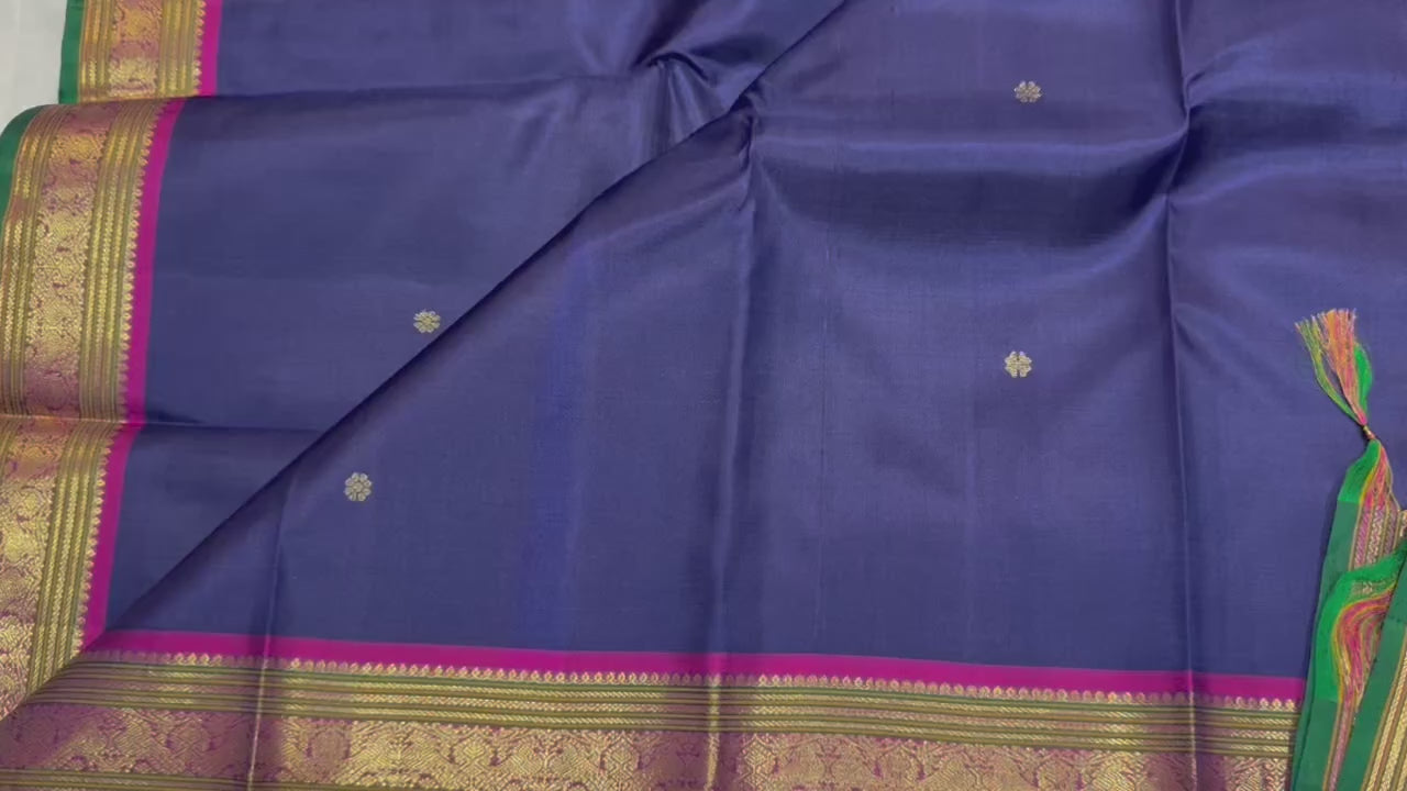 A stunning royal blue Kanchivaram silk saree adorned with delicate gold zari buttas across the body. The vibrant magenta border with intricate gold zari weaving and a rich green edge adds a bold, traditional contrast. The grand pallu and multicolored tassels enhance its festive elegance.