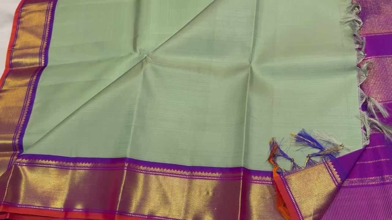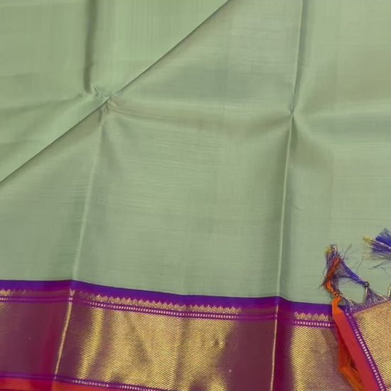 Sage Green Kanchivaram Silk Saree with Purple & Orange Zari Border