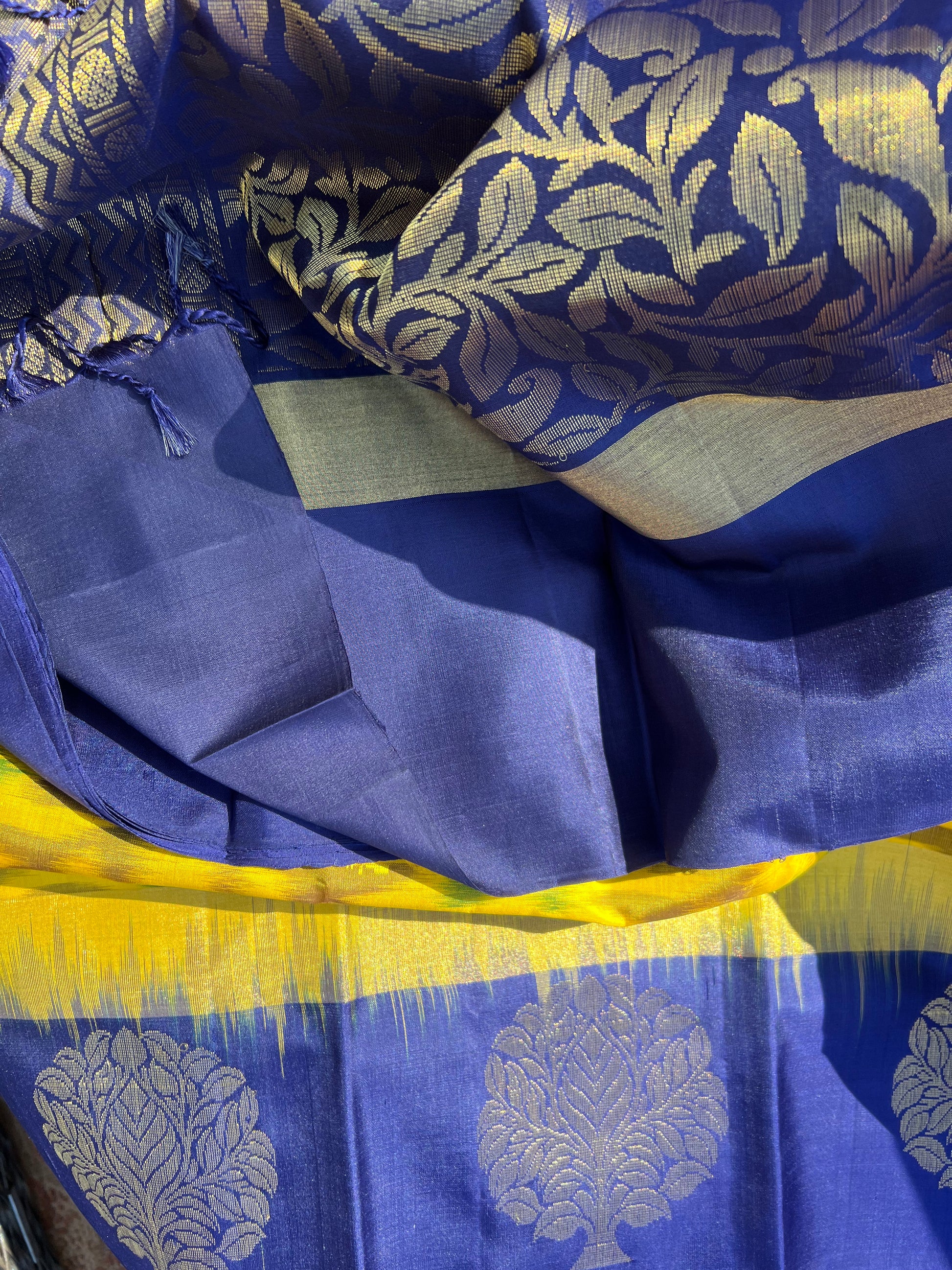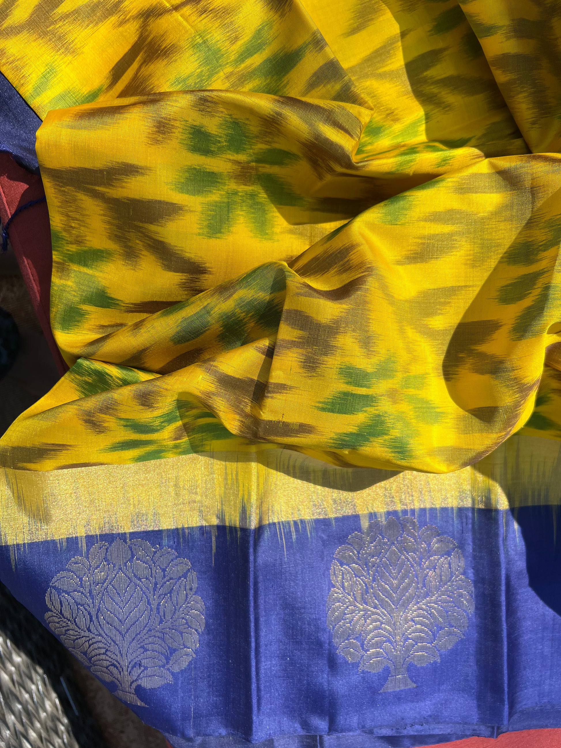 Beautiful lemon yellow saree with all over weave and contrast navy blue border